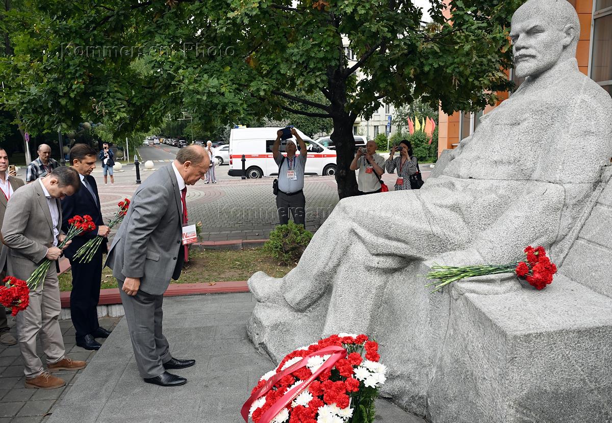 IV-й международный экономический форум КПРФ "Социально-экономическая программа КПРФ и ее законодательное обеспечение" в Культурном центре Совхоза имени Ленина. Лидер КПРФ, руководитель фракции КПРФ в Государственной думе России Геннадий Зюганов (в центре) во время возложения цветов к памятнику вождя революции Владимиру Ленину перед началом форума.