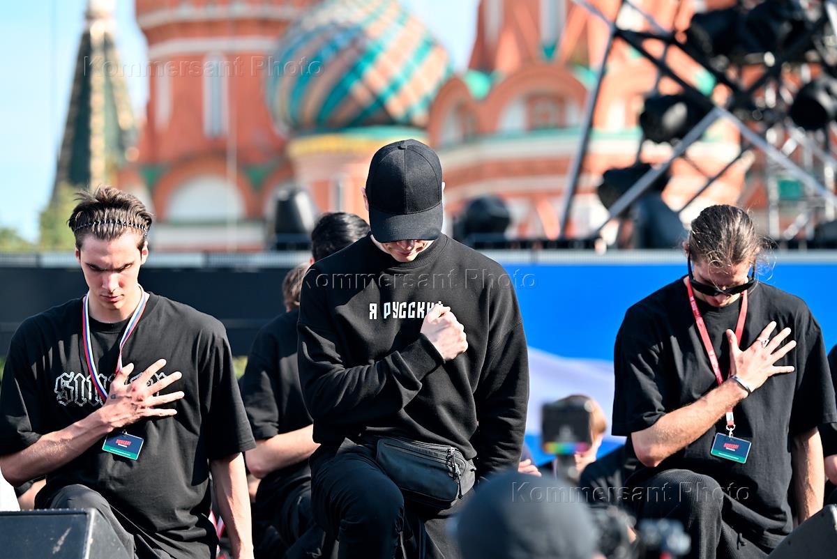 Празднование Дня Государственного флага России. Новая сольная программа "Победа" певца Shaman (Ярослав Дронов) на Красной площади. Певец Shaman (в центре) перед началом концерта.