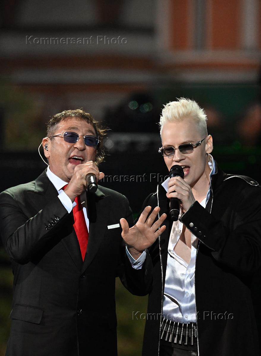 Празднование Дня Государственного флага России. Концерт певца Shaman (Ярослав Дронов) на Красной площади с новой сольной программой "Победа". Певцы SHAMAN (Ярослав Дронов) (справа) и Григорий Лепс (слева) на концерте.