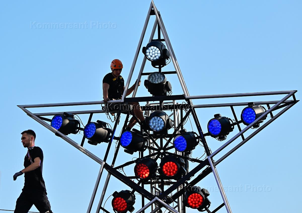 Празднование Дня Государственного флага России. Новая сольная программа "Победа" певца Shaman (Ярослав Дронов) на Красной площади. Подготовка освещения концерта.