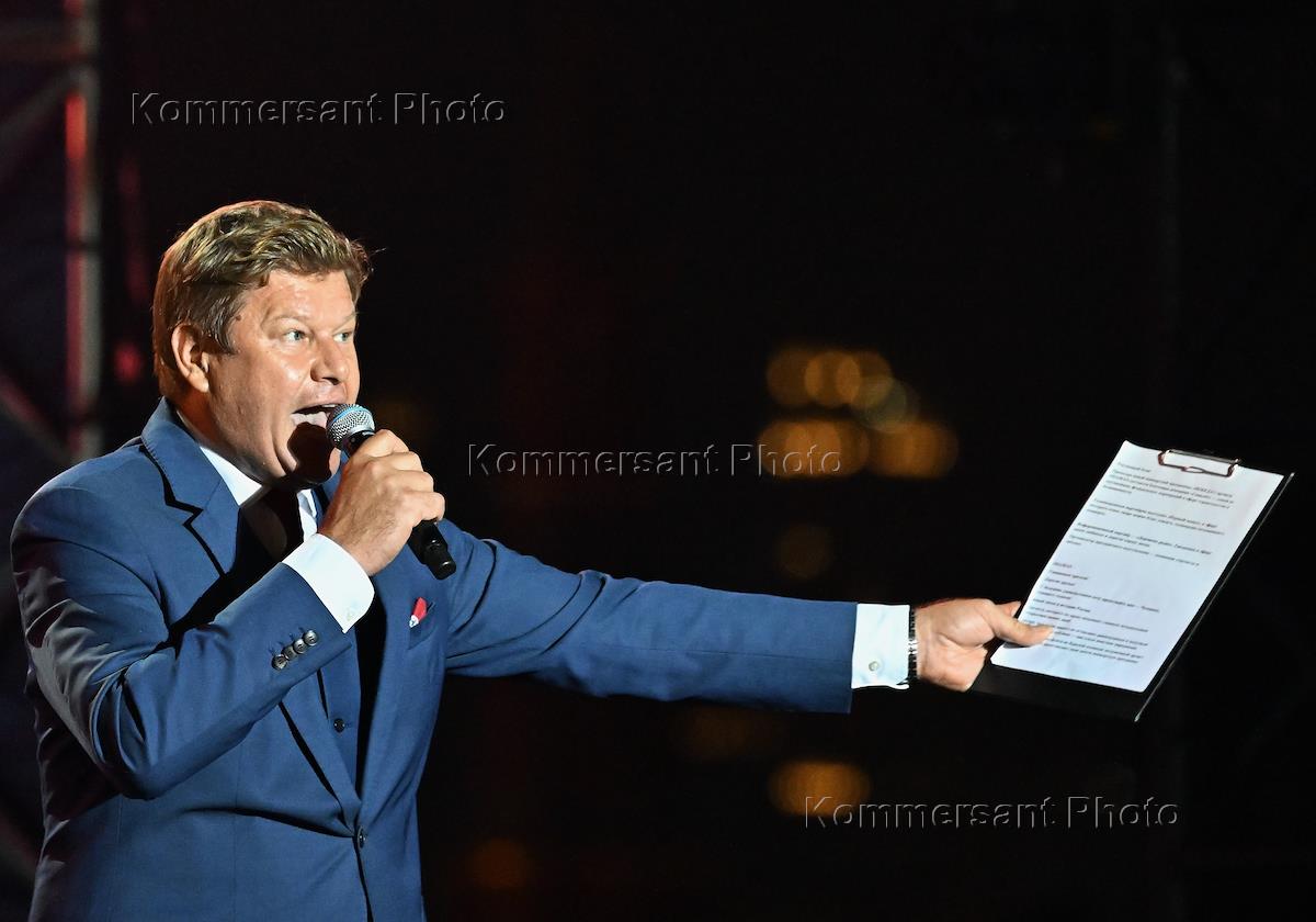 Празднование Дня Государственного флага России. Концерт певца Shaman (Ярослав Дронов) на Красной площади с новой сольной программой "Победа". Телеведущий Дмитрий Губерниев во время концерта.