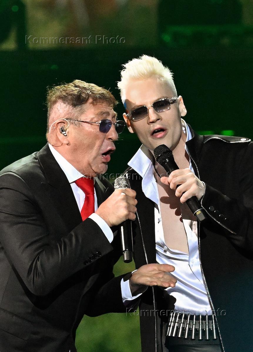 Celebrating the Day of the State Flag of Russia. Concert of the singer Shaman (Yaroslav Dronov) on Red Square with a new solo program "Victory". Singers SHAMAN (Yaroslav Dronov) (right) and Grigory Leps (left) at the concert.