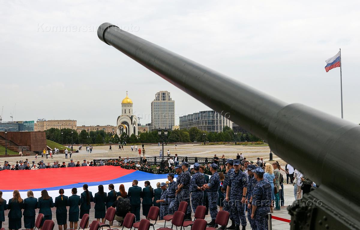 Celebrating the Day of the National Flag of Russia on the square in front of the Victory Museum on Poklonnaya Hill. The flag unfurling ceremony covers an area of more than 1 thousand square meters. Participants during the ceremony.