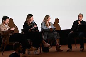 XII Ежегодный российский кинофестиваль короткометражного кино "Короче". Образовательная программа "Лаборатория "Короче"". Слева направо: кинокритик Никита Карцев, режиссер, сценарист Наталья Мещанинова, продюсер Надежда Родионова и кинокритик, отборщик фестиваля Вадим Рутковский во время программы.