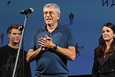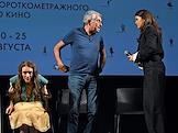 XII Ежегодный российский кинофестиваль короткометражного кино "Короче". Показ фильма "Чистый лист". Слева направо: актриса Зинаида Ястржембская, продюсер Игорь Толстунов и режиссер Полина Кондратьева перед началом показа.