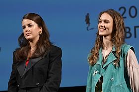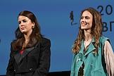 XII Ежегодный российский кинофестиваль короткометражного кино "Короче". Показ фильма "Чистый лист". Режиссер Полина Кондратьева (слева) и актриса Зинаида Ястржембская (справа) перед началом показа.