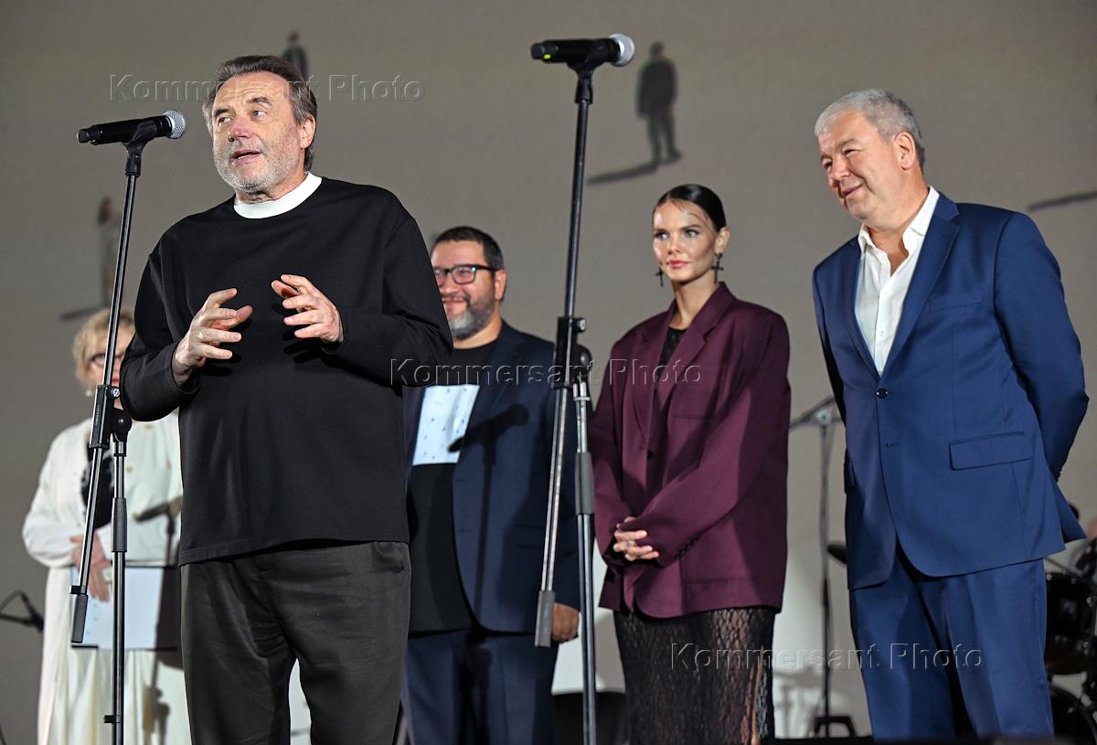 XII Ежегодный российский кинофестиваль короткометражного кино "Короче". Церемония закрытия в Центральном парке. Слева направо: члены жюри фестиваля режиссер Петр Тодоровский, актер Артем Ткаченко, продюсер Сергей Кальварский и актриса Любовь Аксенова на церемонии.