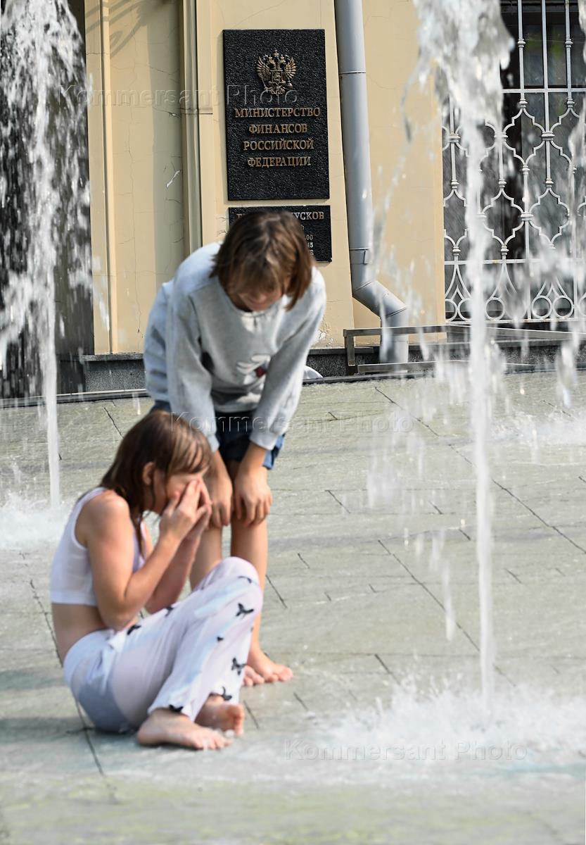 Виды Москвы. Здание Министерства финансов России на улице Ильинка. Жанровая фотография. Девушки босиком на плите фонтана на Биржевой площади.