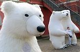 Фестиваль "Арктический салон-2024" на территории Петропавловской крепости. Жанровая фотография. Зрители фотографируются с фигурами полярного белого медведя на фестивале.