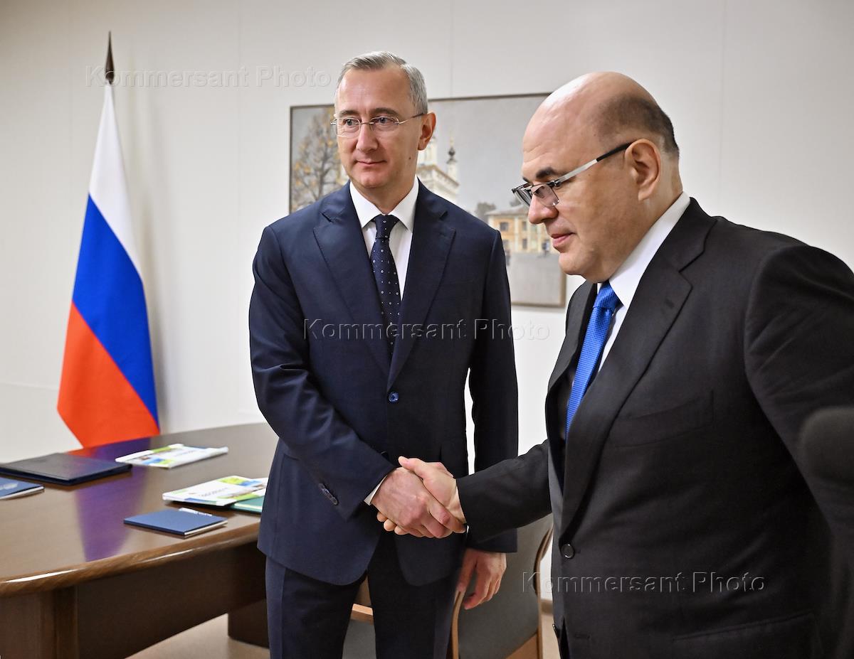 Рабочая поездка председателя правительства Михаила Мишустина в Калугу. Председатель правительства России Михаил Мишустин (справа) и губернатор Калужской области Владислав Шапша (слева) во время встречи.