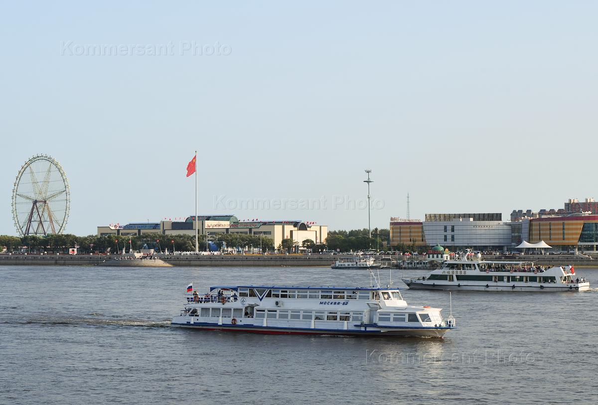Жанровая фотография. Теплоход движется по реке Амур между Благовещенском и Хэйхэ.