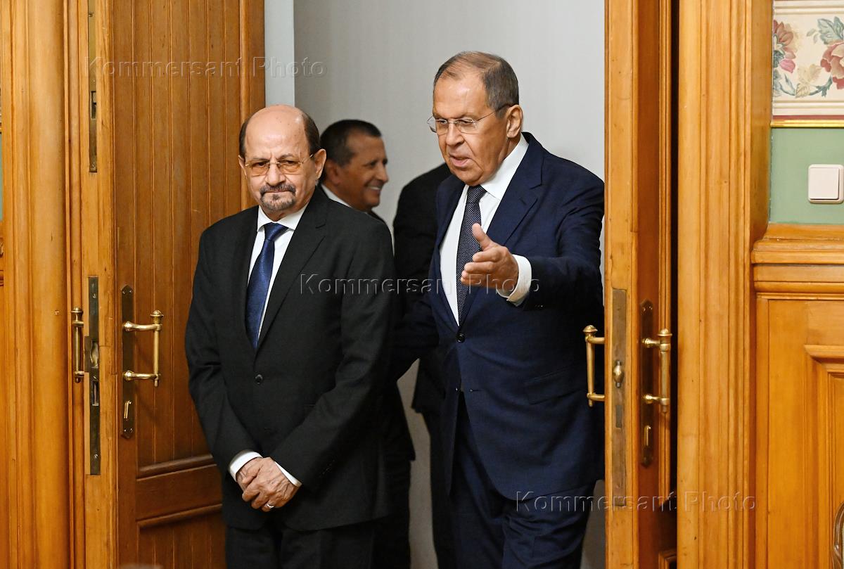 Министр иностранных дел России Сергей Лавров (справа) и министр иностранных дел Йемена Шайа Мохсен аз-Зиндани (слева) перед началом переговоров в Доме приемов МИД России.