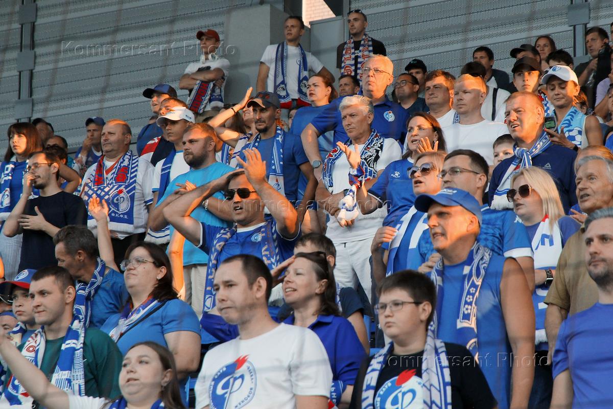 Российская Премьер-Лига (РПЛ). МИР- Чемпионат России по футболу 2024/2025. 6-й тур. Матч между командами "Факел" (Воронеж) - "Оренбург" (Оренбург) на стадионе "Факел". Болельщики команды "Факела" на трибуне стадиона во время матча.
