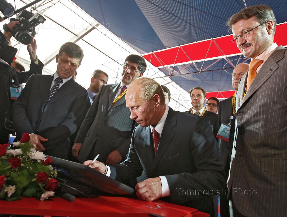 V Международный экономический форум "Кубань - 2006". Президент России Владимир Путин (второй слева), председатель совета директоров холдинга "Балтимор" Алексей Антипов (слева), президент ОАО "Лукойл" Вагит Алекперов (третий слева), руководитель Федерального агентства по туризму Владимир Стржалковский (третий справа), министр транспорта России Игорь Левитин (второй справа) и помощник Президента России Александр Абрамов (справа) перед началом заседания "круглого стола" по вопросам экономического развития Юга России.