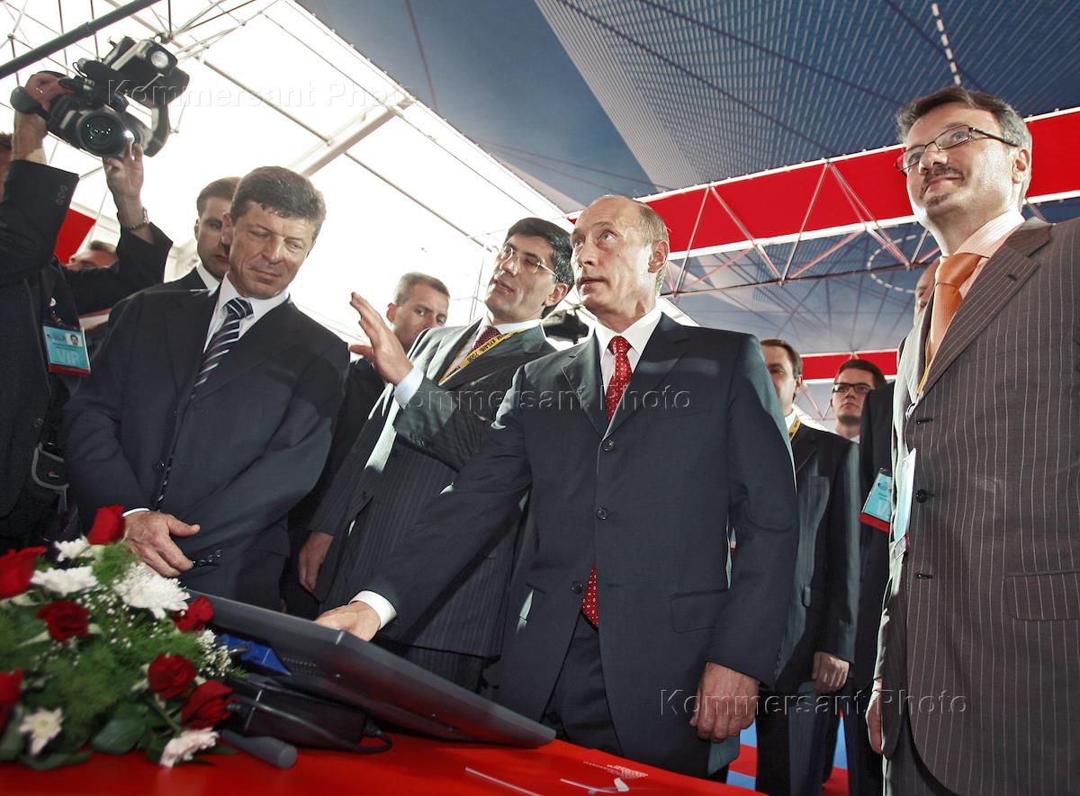 Президент России Владимир Путин (второй справа), полномочный представитель Президента России в Южном Федеральном округе Дмитрий Козак (слева), генеральный директор ОАО "ГАО "Всероссийский выставочный центр" (ВВЦ) Магомед Мусаев (второй слева) и министр экономического развития и торговли России Герман Греф (справа) на торжественной церемонии открытия V Международного экономического форума "Кубань 2006".
