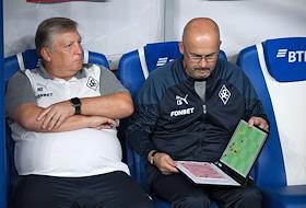 Фонбет - Кубок России по футболу 2024/25. Матч между командами "Динамо" (Москва) - "Крылья Советов" (Самара) на стадионе "ВТБ Арена". Главный тренер команды "Крылья Советов" Игорь Осинькин (слева) во время матча.