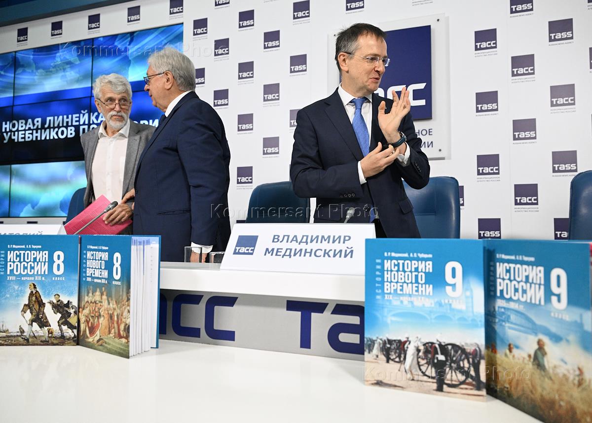 Пресс-конференция, посвященная презентации новой линейки единых учебников по истории для 5-9 классов и учреждений среднего профессионального образования, в пресс-центре ТАСС. Жанровая фотография. Учебники истории в редакции помощника президента России, председателя Российского военно-исторического общества Владимира Мединского, научного руководителя Института всеобщей истории РАН, академика РАН Александра Чубарьяна и ректора МГИМО Анатолия Торкунова.