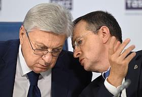 Пресс-конференция, посвященная презентации новой линейки единых учебников по истории для 5-9 классов и учреждений среднего профессионального образования, в пресс-центре ТАСС. Ректор МГИМО Анатолий Торкунов (слева) и помощник президента России, председатель Российского военно-исторического общества Владимир Мединский (справа) перед началом пресс-конференции.