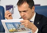 Пресс-конференция, посвященная презентации новой линейки единых учебников по истории для 5-9 классов и учреждений среднего профессионального образования, в пресс-центре ТАСС. Помощник президента России, председатель Российского военно-исторического общества Владимир Мединский на пресс-конференции.