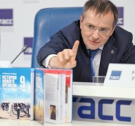 Пресс-конференция, посвященная презентации новой линейки единых учебников по истории для 5-9 классов и учреждений среднего профессионального образования, в пресс-центре ТАСС. Академик Российской академии наук (РАН), директор Института археологии РАН Николай Макаров на пресс-конференции.