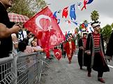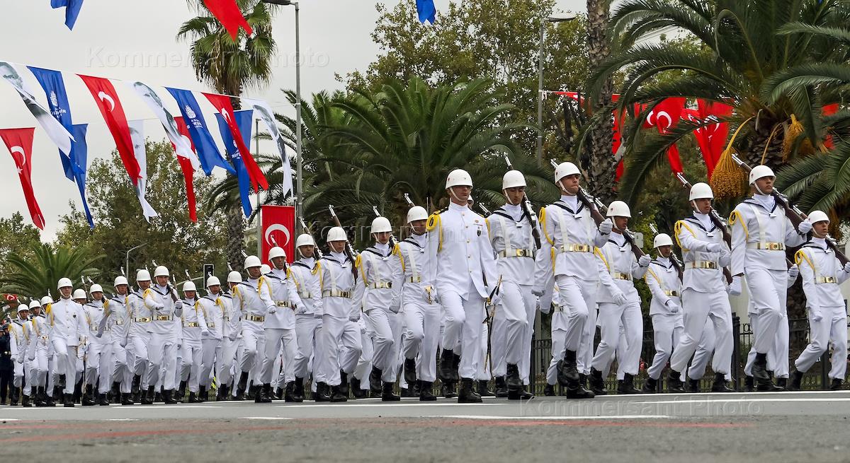 Военный парад в честь празднования 102-й годовщины Дня Победы. Жанровая фотография. Военнослужащие в военной форме разных эпох во время парада.