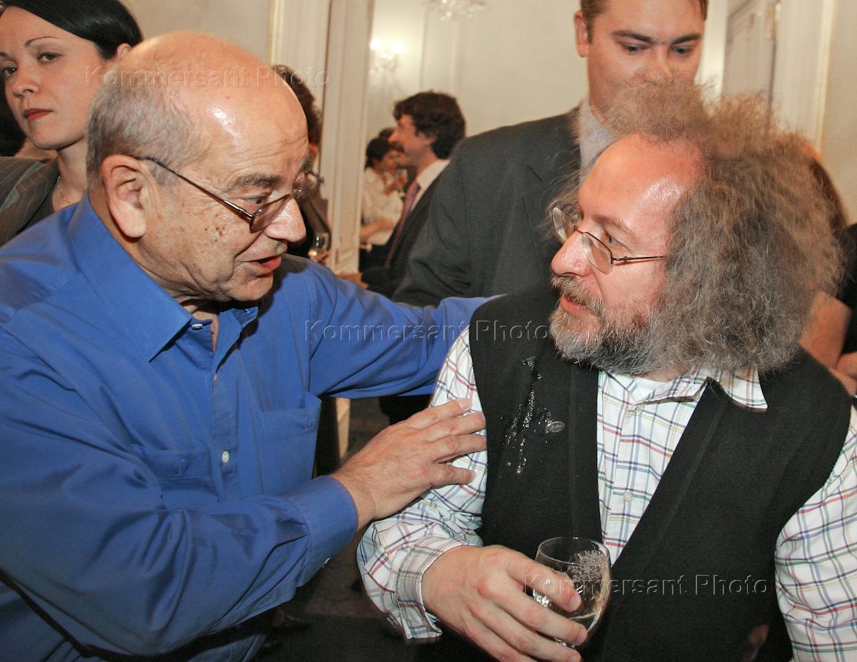 Главный редактор радиостанции "Эхо Москвы" Алексей Венедиктов (справа) и писатель Владимир Войнович (слева) на праздновании 16 - летия радиостанции "Эхо Москвы" в ресторане "Прага".