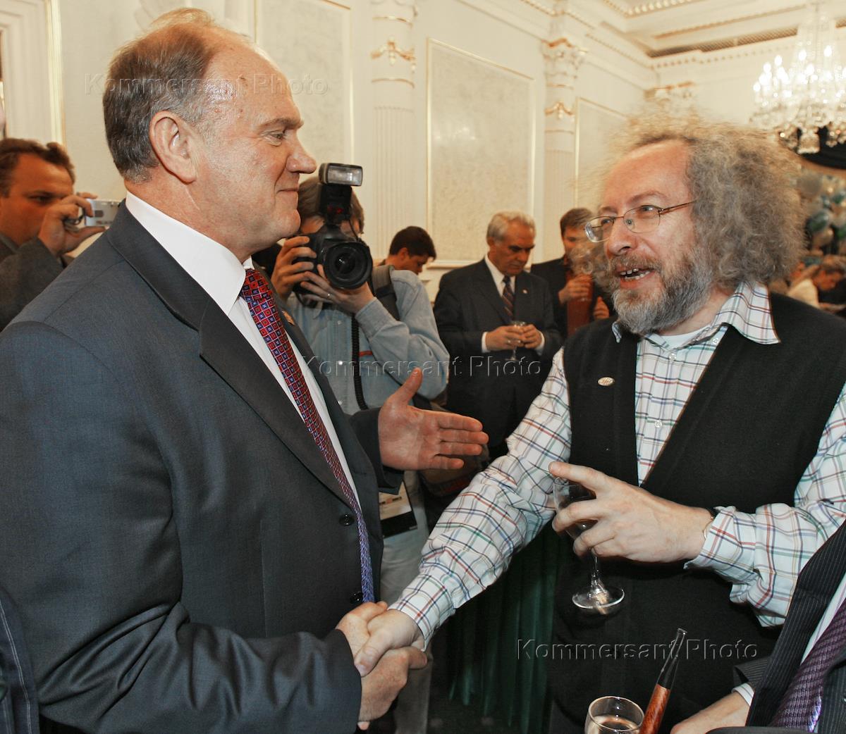Главный редактор радиостанции "Эхо Москвы" Алексей Венедиктов (справа) и лидер Коммунистической партии России (КПРФ) Геннадий Зюганов (слева) на праздновании 16 - летия радиостанции "Эхо Москвы" в ресторане "Прага".