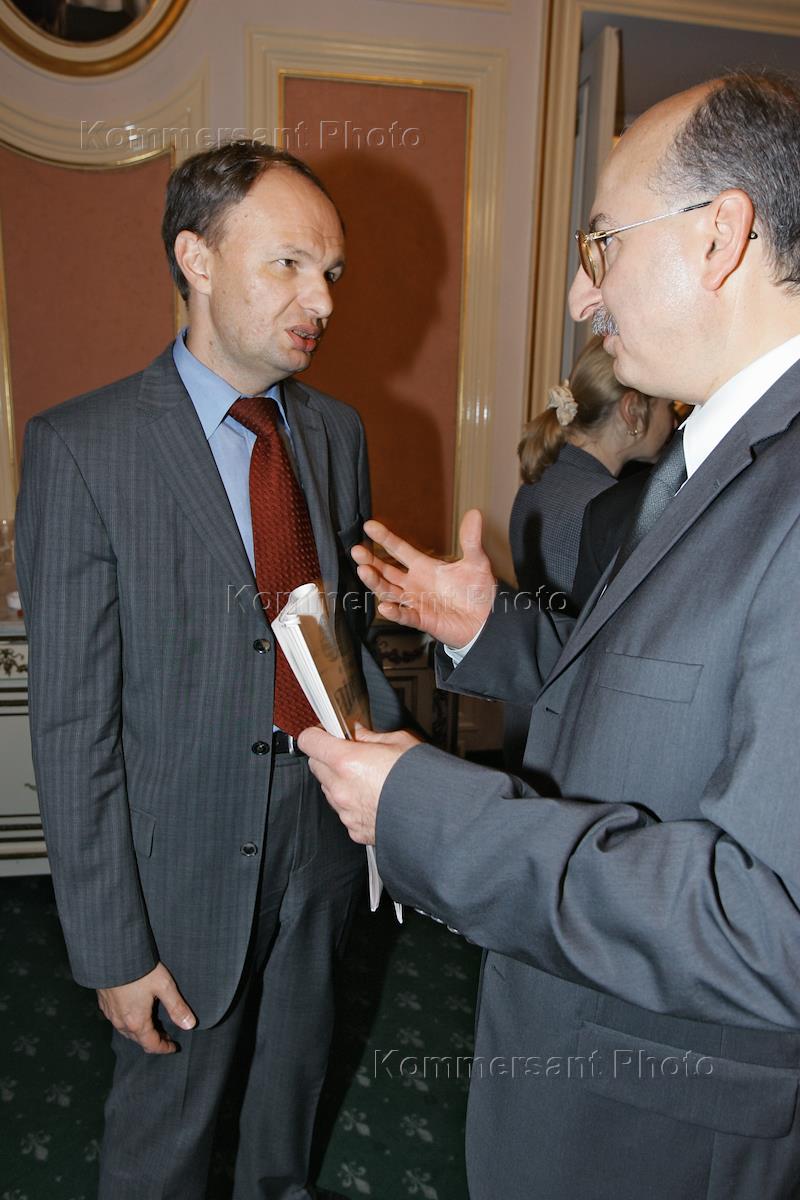 Министр образования и науки России Андрей Фурсенко (слева) и главный редактор радиостанции "Эхо Москвы" Алексей Венедиктов (справа) на праздновании 16 - летия радиостанции "Эхо Москвы" в ресторане "Прага".