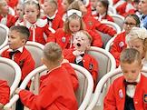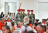 День знаний. Торжественная линейка в школе № 280 имени М.Ю. Лермонтова. Жанровая фотография. Учащиеся во время линейки в актовом зале школы.
