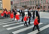 День знаний. Торжественная линейка в школе № 280 имени М.Ю. Лермонтова. Жанровая фотография. Учащиеся перед началом линейки у здания школы.