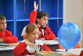 День знаний. Торжественная линейка в школе № 280 имени М.Ю. Лермонтова. Жанровая фотография. Учащиеся начальной школы во время урока.