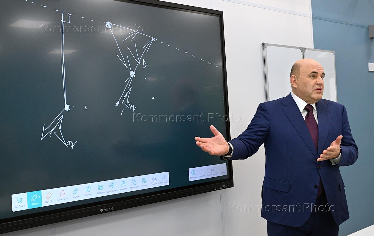 Председатель правительства России Михаил Мишустин во время посещения инженерно-технического лицея "Авиатика" в городе Лобня.
