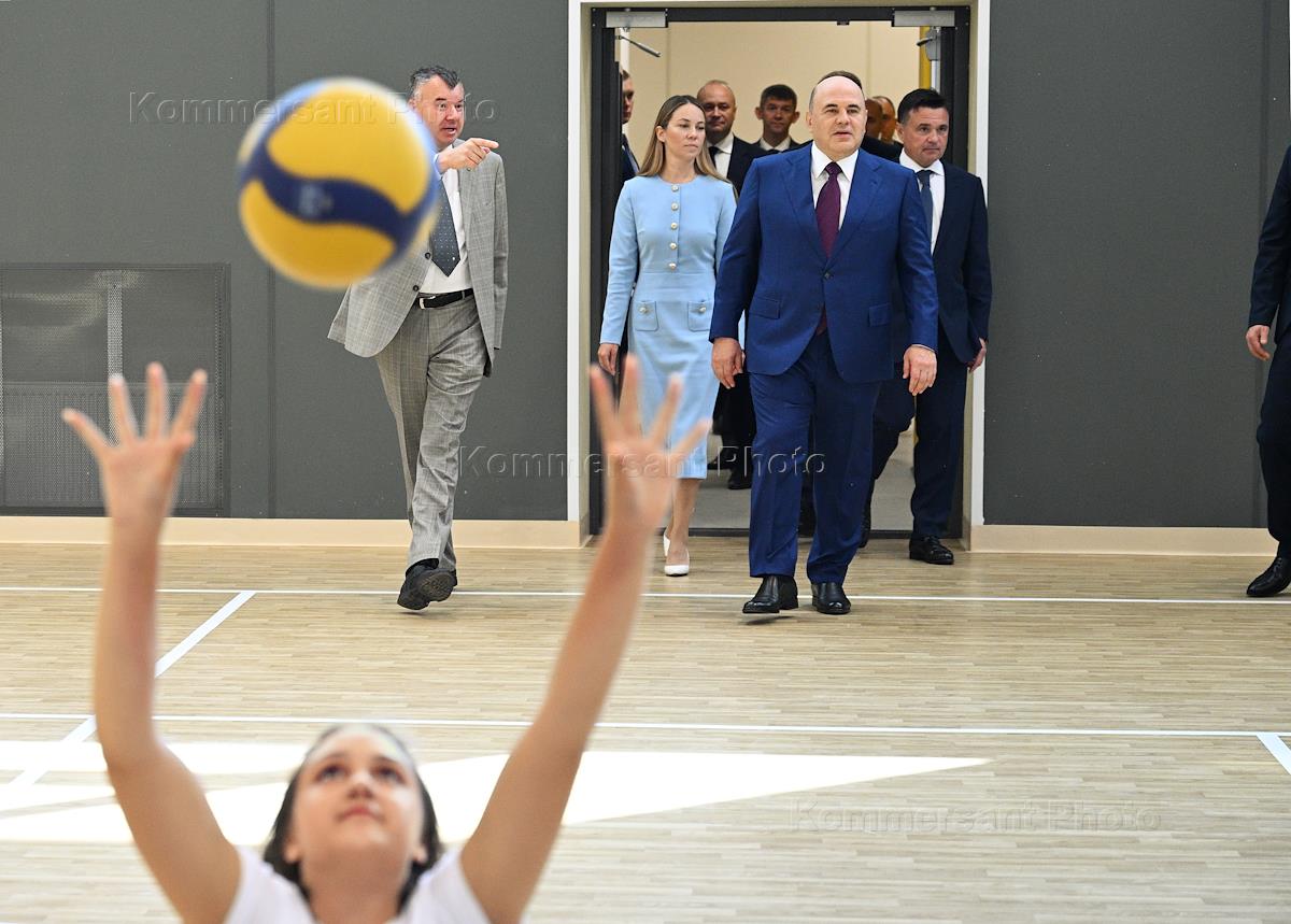 Председатель правительства России Михаил Мишустин посетил инженерно-технический лицей "Авиатика" в городе Лобня. Заместитель министра просвещения России Ирина Шварцман (вторая справа), председатель Правительства России Михаил Мишустин (справа) и губернатор Московской области Андрей Воробьев (в центре) во время посещения лицея.