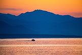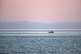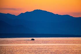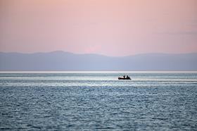 Виды Иркутской области. Жанровая фотография. Рыбаки на вечернем клёве в лодке у южного берега озера Байкал.