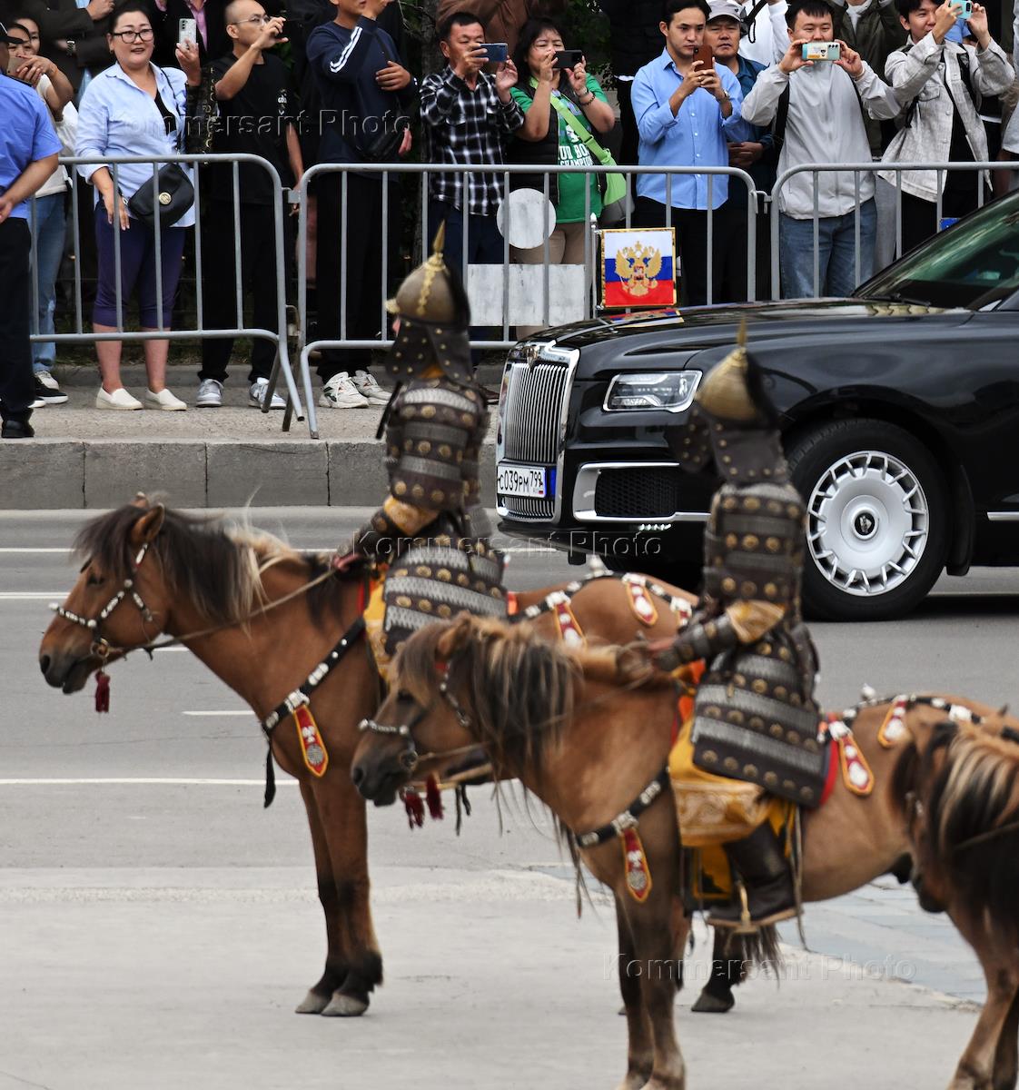 Официальный визит президента России Владимира Путина в Монголию. Автомобиль президента России Владимира Путина на площади Сухэ-Батора перед началом церемонии официальной встречи.