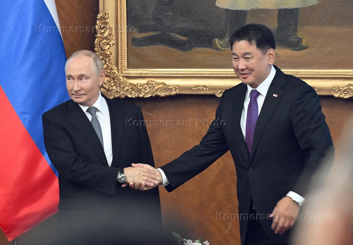 Официальный визит президента России Владимира Путина в Монголию. Российско-монгольские переговоры в Государственном дворце. Президент России Владимир Путин (слева) и президент Монголии Ухнаагийн Хурэлсух (справа) во время церемонии подписания документов по итогам переговоров.