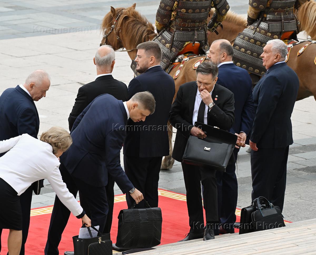Официальный визит президента России Владимира Путина в Монголию. Слева направо: заместитель председателя правительства России Алексей Оверчук, министр спорта России Михаил Дегтярев и помощник президента России Юрий Ушаков после церемонии официальной встречи на площади Сухэ-Батора.