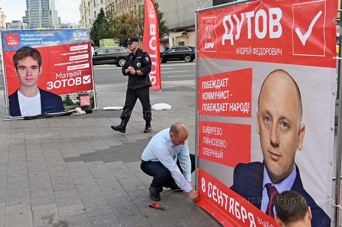 Акция "Красные в городе", посвященная участию КПРФ в выборах депутатов Московской городской думы (Мосгордумы), на площади Маяковского. Жанровая фотография. Предвыборные плакаты кандидатов на выборах Матвея Зотова и Андрея Дутова.