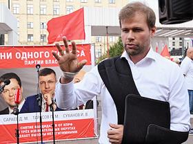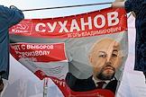 Акция "Красные в городе", посвященная участию КПРФ в выборах депутатов Московской городской думы (Мосгордумы), на площади Маяковского. Жанровая фотография. Предвыборный плакат кандидата на выборах Игоря Суханова.