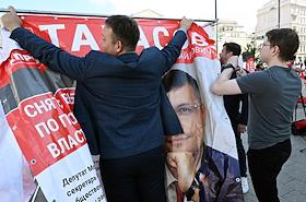 Акция "Красные в городе", посвященная участию КПРФ в выборах депутатов Московской городской думы (Мосгордумы), на площади Маяковского. Жанровая фотография. Предвыборные плакаты кандидатов на выборах Андрея Дутова и Александра Ищенко.