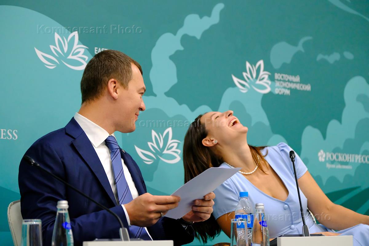 Восточный экономический форум (ВЭФ) 2024 на территории Дальневосточного федерального университета (ДВФУ) на острове Русский. Второй день. Министр спорта России Михаил Дегтярев (слева) и двукратная олимпийская чемпионка по фехтованию Яна Егорян (справа) во время сессии "Смена вех в мировом спорте. Формируя наш ответ".