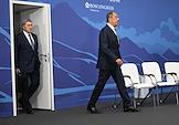 Рабочая поездка президента России Владимира Путина в Дальневосточный федеральный округ. Восточный экономический форум (ВЭФ) 2024 на территории Дальневосточного федерального университета (ДВФУ) на острове Русский. Помощник президента России Юрий Ушаков (слева) и заместитель руководителя администрации президента России Максим Орешкин (справа) перед началом встречи президента России Владимира Путина с премьер-министром Малайзии Анваром Ибрагимом в рамках форума.
