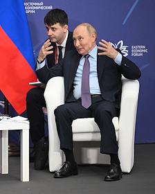Рабочая поездка президента России Владимира Путина в Дальневосточный федеральный округ. Восточный экономический форум (ВЭФ) 2024 на территории Дальневосточного федерального университета (ДВФУ) на острове Русский. Помощник президента России Юрий Ушаков (слева) и министр экономического развития России Максим Решетников (справа) перед началом встречи президента России Владимира Путина с заместителем председателя КНР Хань Чженом в рамках форума.