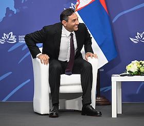 Рабочая поездка президента России Владимира Путина в Дальневосточный федеральный округ. Восточный экономический форум (ВЭФ) 2024 на территории Дальневосточного федерального университета (ДВФУ) на острове Русский. Вице-премьер Сербии Александр Вулин во время встречи с президентом России Владимиром Путиным в рамках форума.