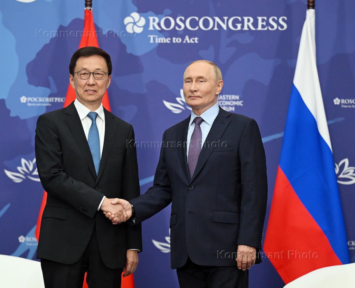 Рабочая поездка президента России Владимира Путина в Дальневосточный федеральный округ. Восточный экономический форум (ВЭФ) 2024 на территории Дальневосточного федерального университета (ДВФУ) на острове Русский. Президент России Владимир Путин (справа) и заместитель председателя КНР Хань Чжен (слева) во время встречи в рамках форума.