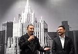 Церемония открытия выставки фотографов Сергея Борисова и Михаила Розанова "Город сказка" в Московском музее современного искусства (ММОМА). Фотограф Василий Кудрявцев (в центре) и исполнительный директор Московского музея современного искусства (ММСИ) Василий Церетели (справа) на церемонии.
