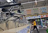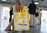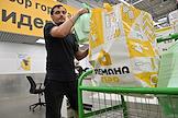 Торжественная церемония открытия первого полностью ребрендированного магазина "Лемана ПРО" (бывший "Леруа Мерлен") в Мытищах. Покупатель с товаром на кассе во время оплаты.