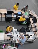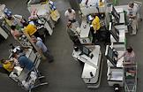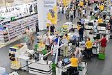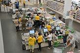 Торжественная церемония открытия первого полностью ребрендированного магазина "Лемана ПРО" (бывший "Леруа Мерлен") в Мытищах. Покупатели на кассе оплаты товара.