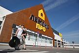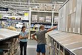 Торжественная церемония открытия первого полностью ребрендированного магазина "Лемана ПРО" (бывший "Леруа Мерлен") в Мытищах. Покупатель в отделе напольных покрытий для дома.