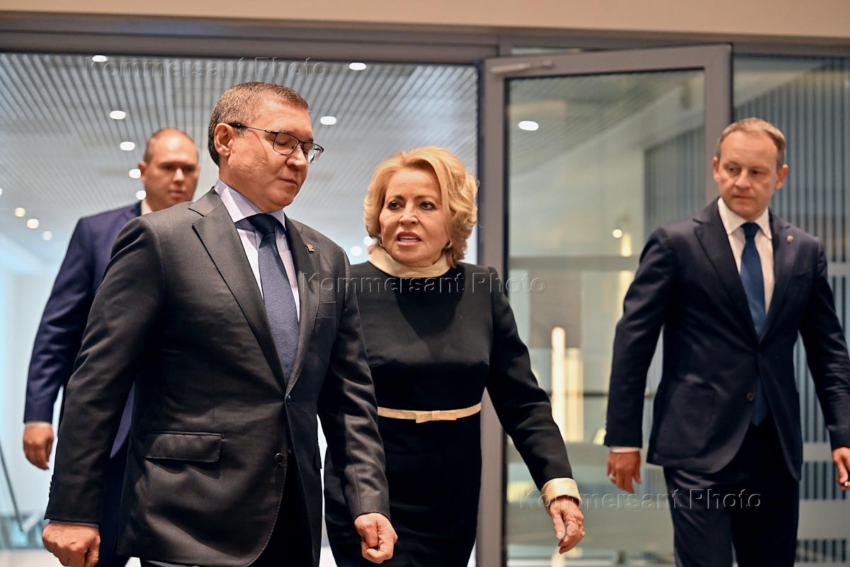 Совместное заседание президиума Генерального совета и бюро Высшего совета партии "Единая Россия" по предварительным результатам выборов в единый день голосования в Центральном исполкоме партии "Единая Россия". Справа налево: руководитель Центрального исполнительного комитета партии "Единая Россия", заместитель секретаря генерального совета партии Александр Сидякин, председатель Совета Федерации России Валентина Матвиенко и полномочный представитель президента России в Уральском федеральном округе Владимир Якушев (слева) перед началом заседания.